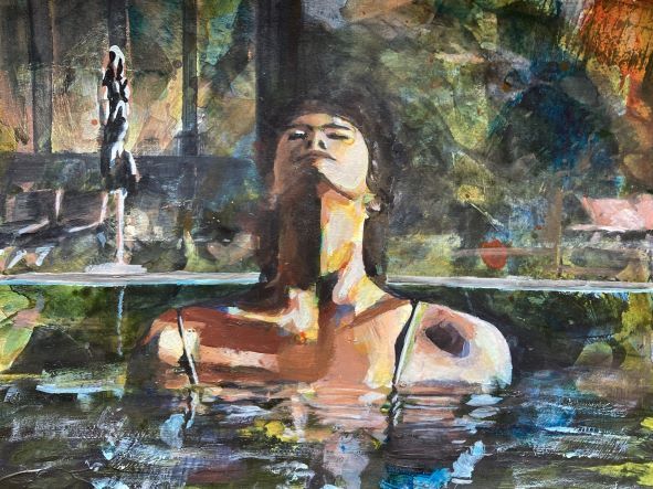 Wir sehen Frauen in versunkener Pose, einer Selbstumarmung, sich schützend oder in nachdenklicher Haltung. Die Gemälde passen gut in private Räume, wo wir uns zurückziehen, uns um uns selbst kümmern.